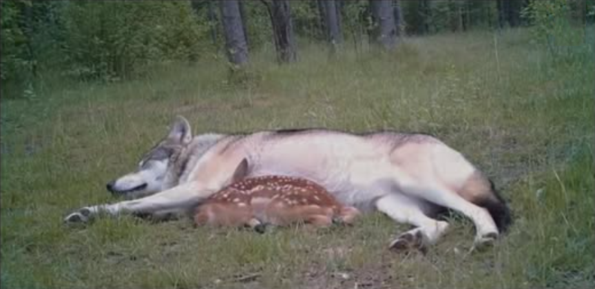 In another clip, the fawn is curled up against the wolf, sleeping. The wolf stays alert, standing watch like a guard. Specialists who saw the footage said it’s rare, but not impossible, for animals to form strange bonds when one is alone and the other is lost.