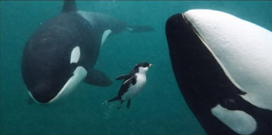 Then came the most unexpected moment. Footage shows the orcas bringing food toward the penguin.