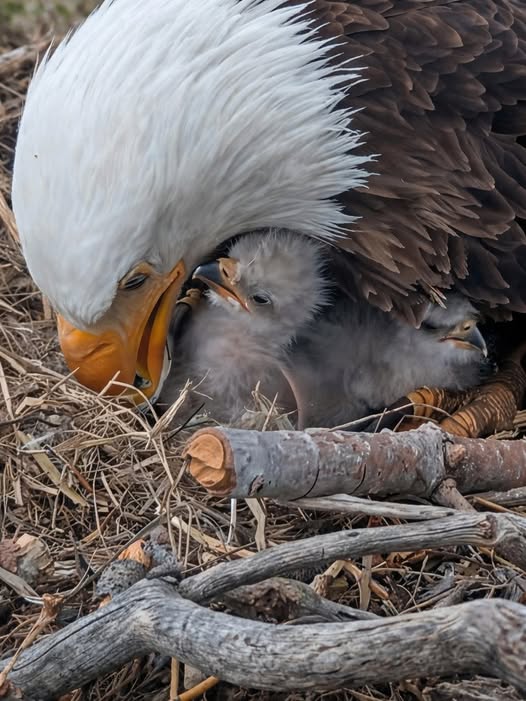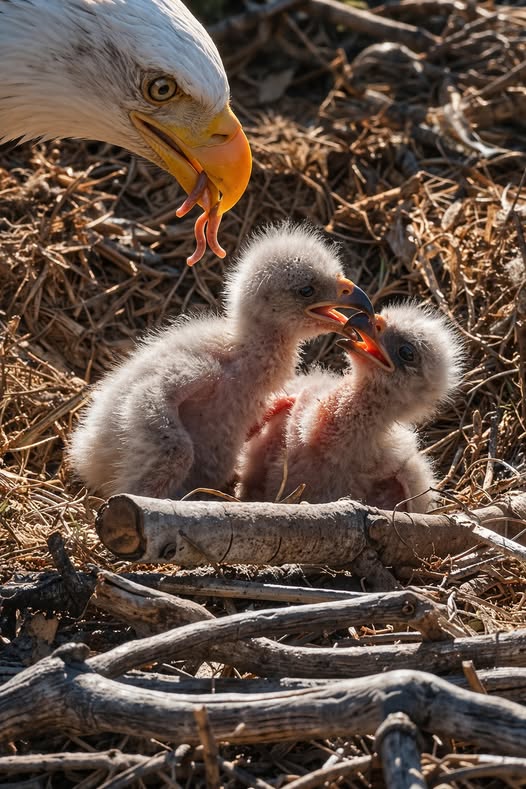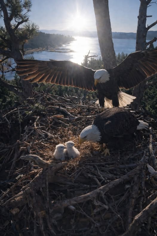 High above the earth, in a nest woven from rough sticks and weathered branches, two tiny lives rest against one another as if they already know something the world has not yet taught them. There is no struggle, no sound, no urgency. Only stillness. Only warmth. Only the quiet comfort of being close.