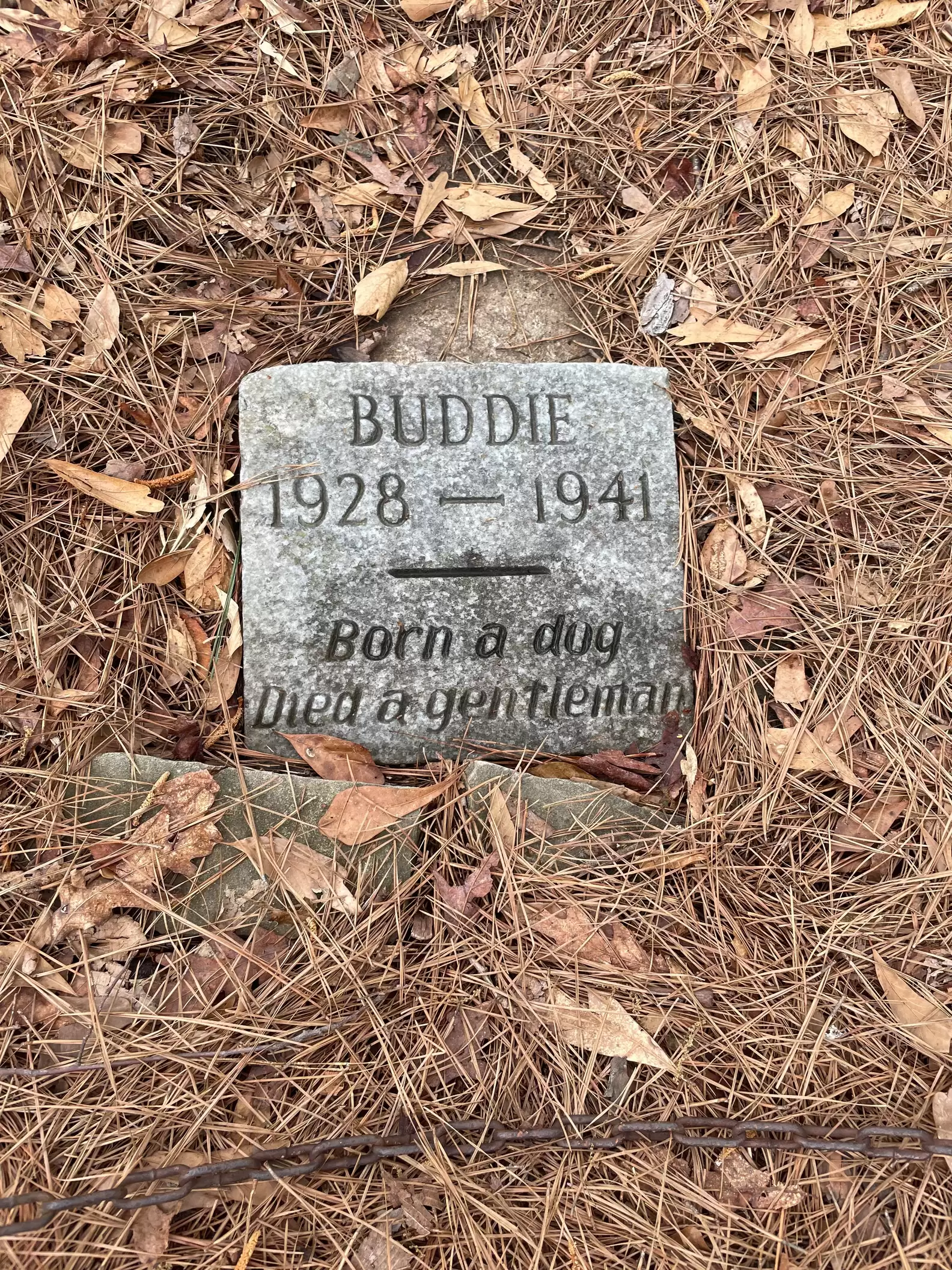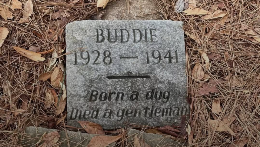 The inscription read: “Buddie, 1928 — 1941. Born a dog / Died a gentleman.”