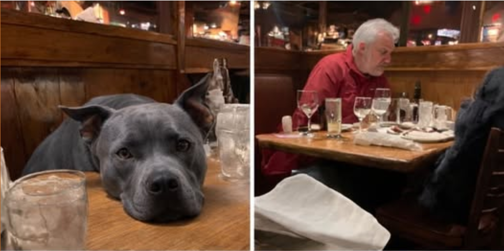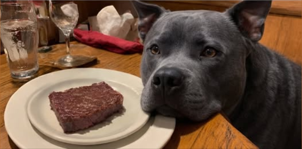 While glasses clinked and conversations buzzed, he rested his head gently on the table, eyes steady, manners flawless. No barking. No begging. No [ch.a.os]. Just gratitude in its purest form—waiting patiently as a modest steak was placed in front of him. A well-earned bite, on Veterans Day, for a veteran who happens to have four legs and a pit bull smile.