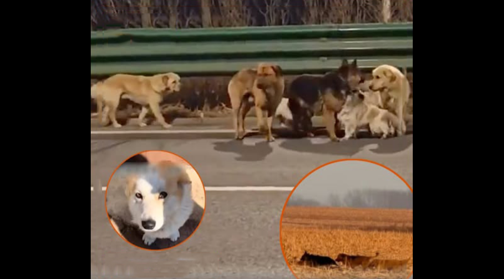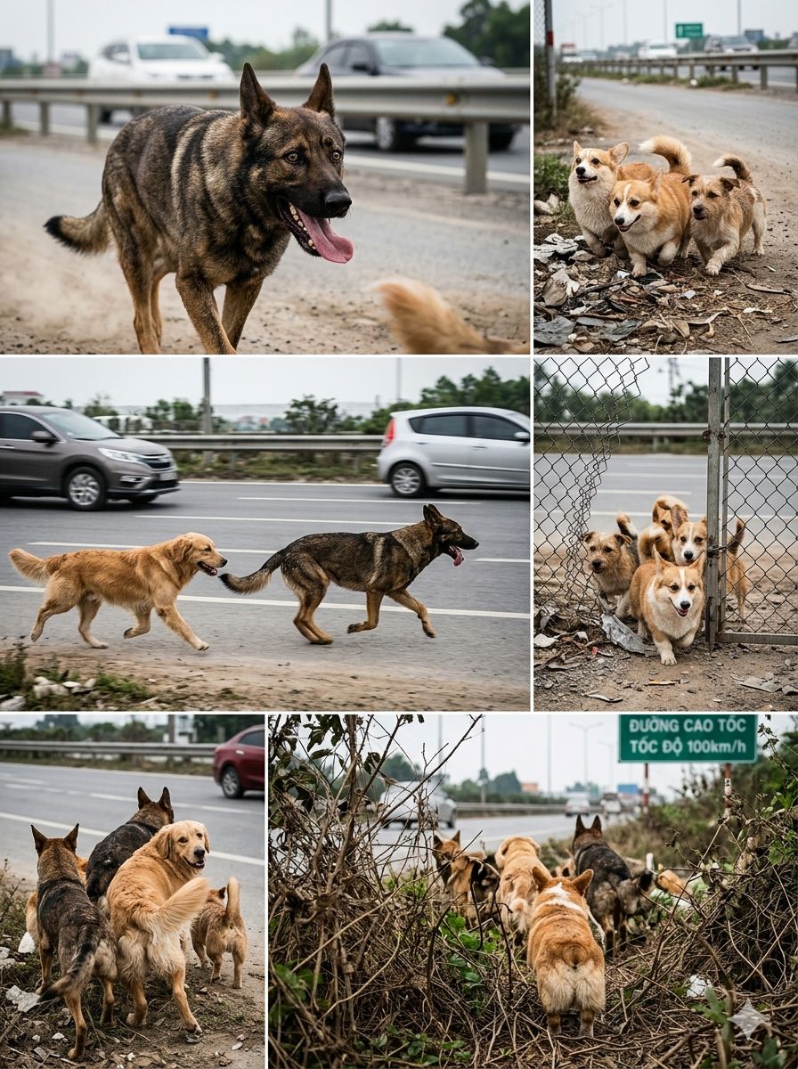 Near a highway, in Changchun, China. locals spotted seven dogs of different breeds—German Shepherd, Golden Retriever, Corgi, and others—moving together as a group, looking [fr.igh.ten.ed and di.sor.ien.ted]. 🐶😟